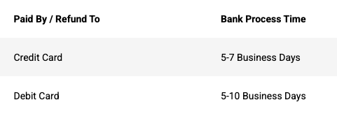 Once we process your refund, you’ll receive an email showing that it’s complete. Please note, it can take some time for it to show up on your credit card statement depending on your bank or credit card company.